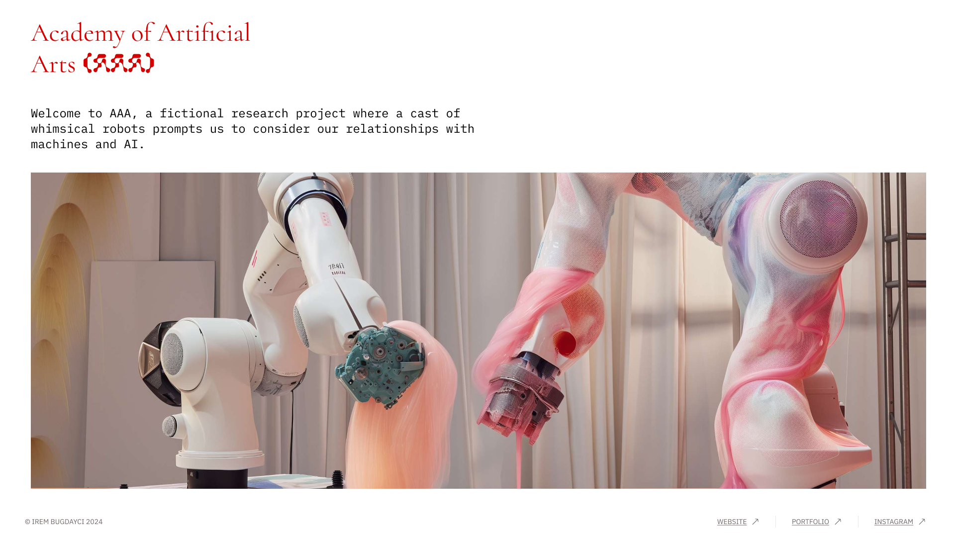 The Academy of Artificial Arts (AAA) is a speculative foray into a fictitious art school for robots, exploring outsourced agency, creativity beyond authenticity, and multi-intelligence algorithmic existence. Drawing inspiration from Luna, my first robot, who came to be characterized as cute and shy by many, the project probes into the affective nature of technology and the role of our perception within this ecology. Throughout the series you will come across a semiotic branch of articulated robot arms that by design have different functions from which their creative practices sprout.